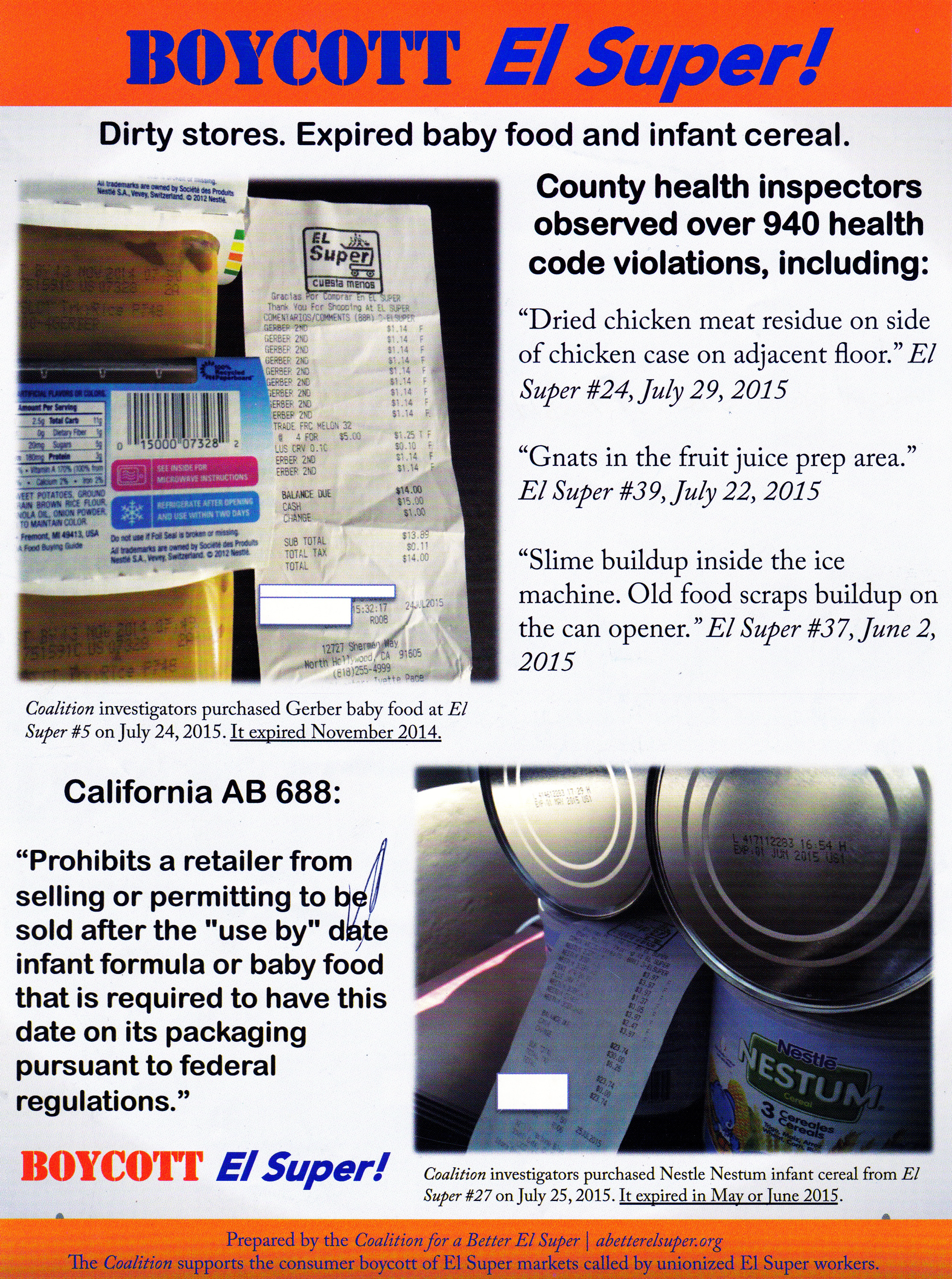 It is one of the dirtiest stores in California! They have been found selling products like “Gerber Baby Food” at El Supers store #5 that was expired! The baby food was purchased on July 24th, 2015 and expired on November 2014. California AB688 states the following: Prohibits a retailer from selling or permitting to be sold after the “Use By” date infant formula or baby food that is required to have this date on its packaging pursuant to federal regulation” On July 29th 2015 at El Super store# 24 “Dried chicken meat residue was found on the side of a chicken case on adjacent floor!” On July 22nd 2015 at store# 39 “Gnats in the fruit juice prep area!” Also on June 2nd 2015 at store# 37 “Slime build up inside the ice machine & old food scraps buildup on the can opener”. El Super UFCW members have been fighting for respect and a fair contract for nearly two years! El Super has finally agreed to return to negotiations, on August 18 and September 18 for the first time in more than a year. For El Super to return to the table, the Federal Government had to get involved. On August 7, the company entered into an agreement with the U.S. Government to settle charges that it violated workers’ federally protected rights. The settlement includes reinstatement of fired union activist Fermin Rodriques, and a commitment to make workers whole for unilateral changes to its vacation policy. The agreement also includes a commitment by El Super to bargain in good faith. As a wise man once said! “If there are no absolutes by which to judge the thoughts and actions of a society, they the society becomes absolute!” – Francis Schaeffer. This becomes dangerous for a society because if a society passed laws meant to protect that society and they are ignored and disregarded this is the result! Chaos & Despair for the society and its citizens! “Men cannot be the measure of all things” – Francis Schaeffer. Meaning when men measure their own thoughts and actions and impose them on the society in whole, what is stopping the next person or corporation to do the same against the society without their consent?